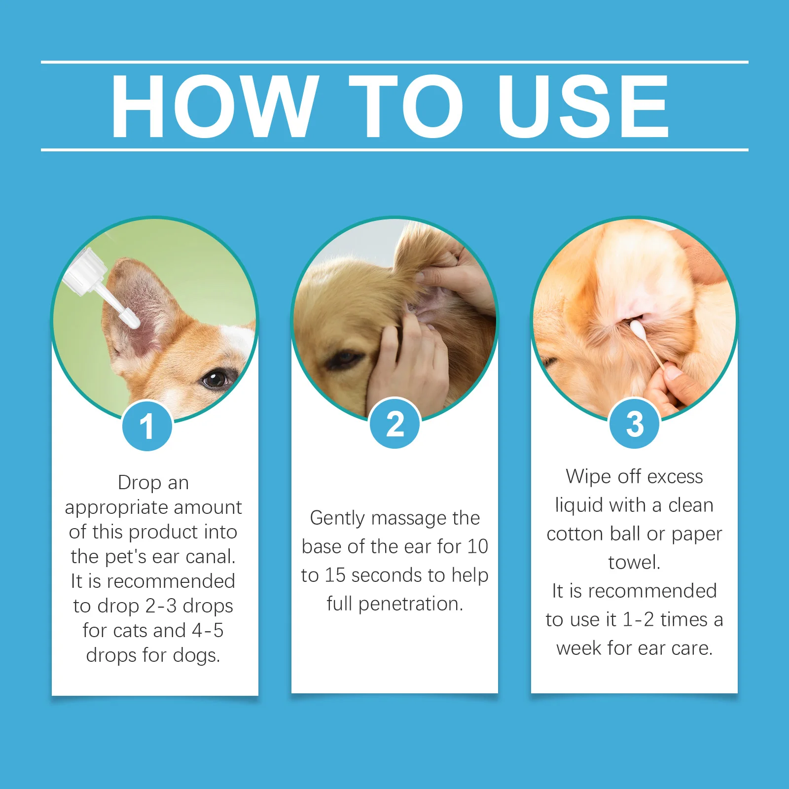 1.Drop an appropriate amount of this product into the pet's ear canal. It is recommended to drop 2-3 drops for cats and 4-5 drops for dogs.